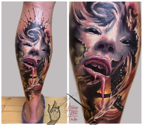 腿部彩色恐怖风格的神秘女人肖像纹身