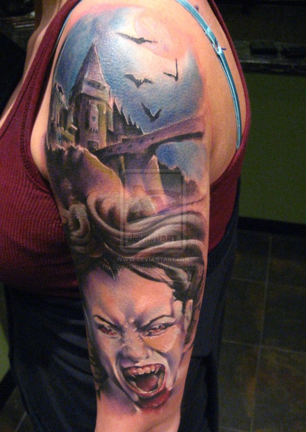 手臂彩色恐怖电影大城堡与吸血鬼女人纹身
