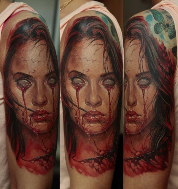 肩部恐怖电影彩色毛骨悚然女人纹身