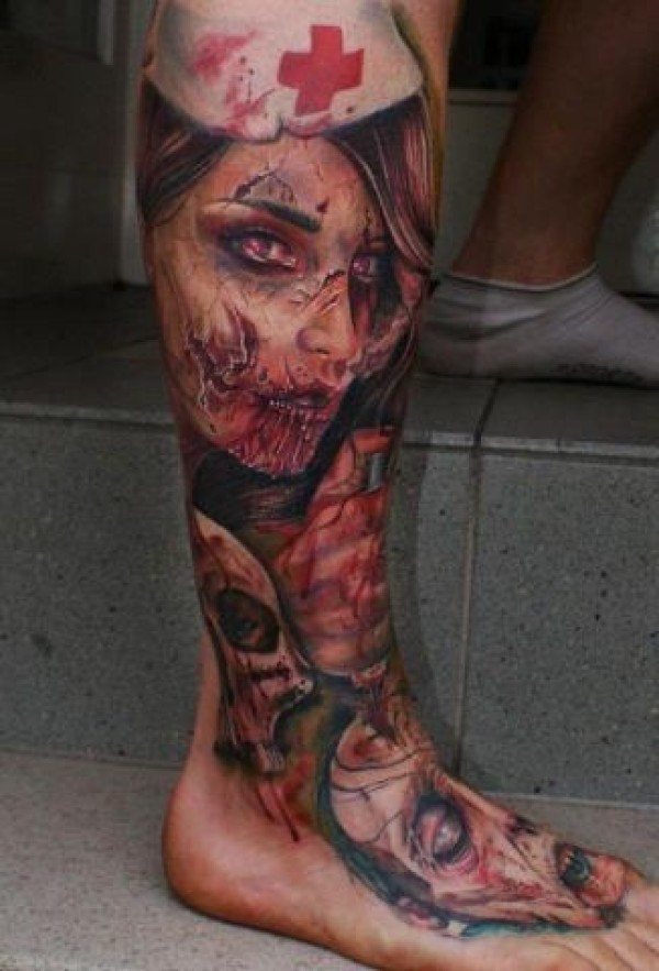 腿部彩色血腥逼真的恐怖僵尸护士纹身