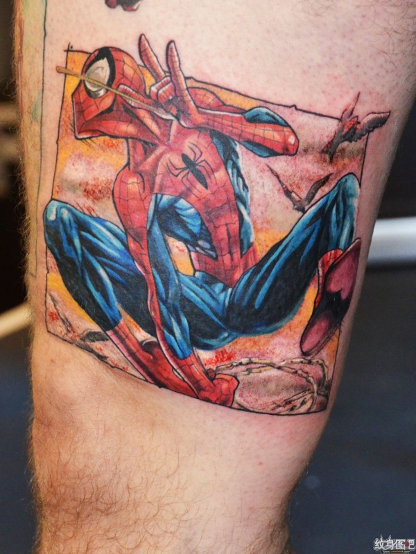 纹在了大腿腿面上的蜘蛛侠纹身图案