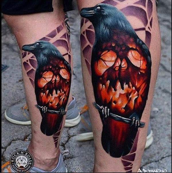 腿部彩色大乌鸦燃烧头骨纹身图案