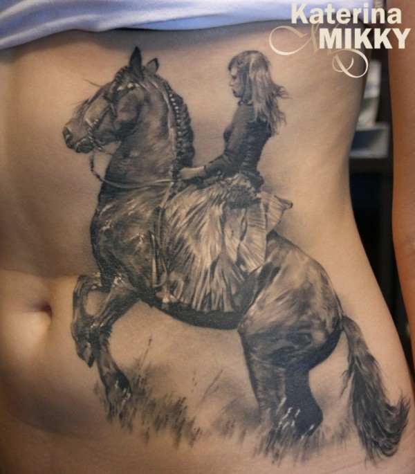 腹部逼真的少女骑马纹身图案
