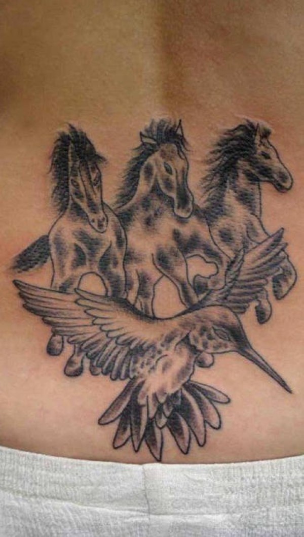 腰部棕色三匹马和蜂鸟纹身图片
