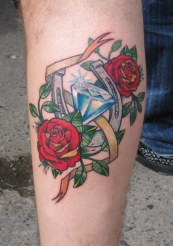 腿部旧货风格彩色马蹄铁与玫瑰纹身