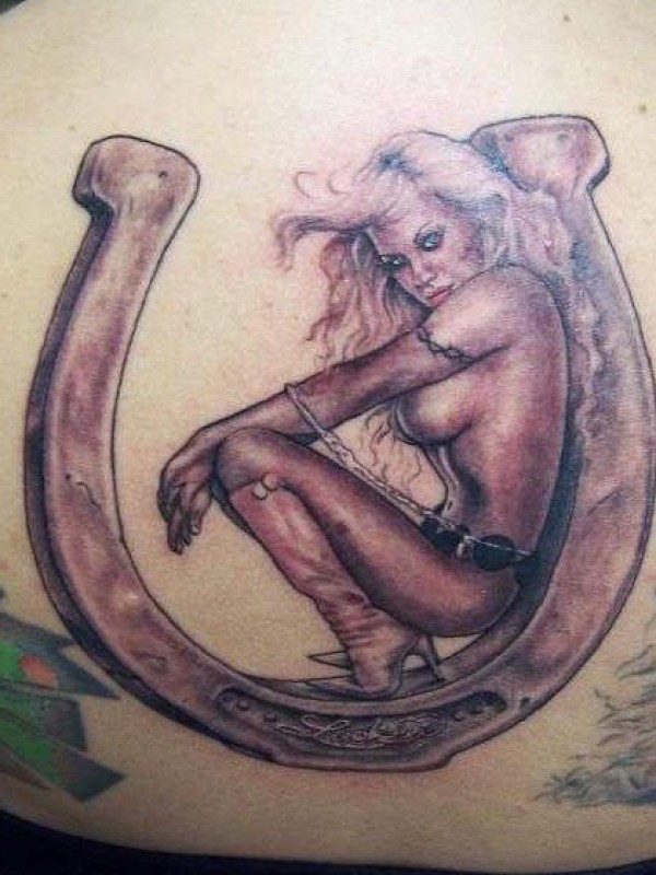 背部棕色马蹄铁和性感夫人纹身图片