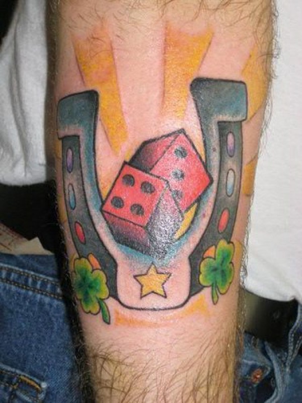 腿部彩色幸运的马蹄和骰子纹身图片