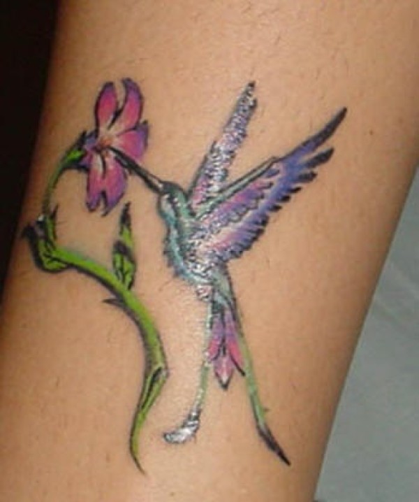 腿部彩色壮丽的蜂鸟与花纹身图片