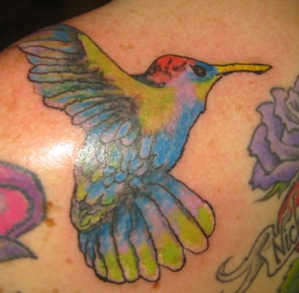 肩部彩色蜂鸟纹身图案