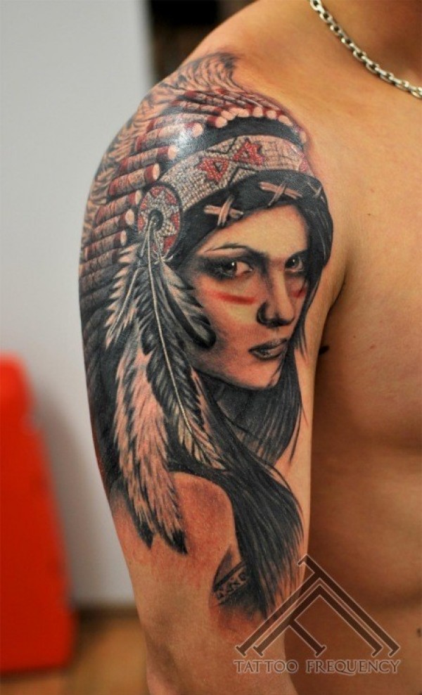肩部彩色逼真的印第安女人肖像纹身