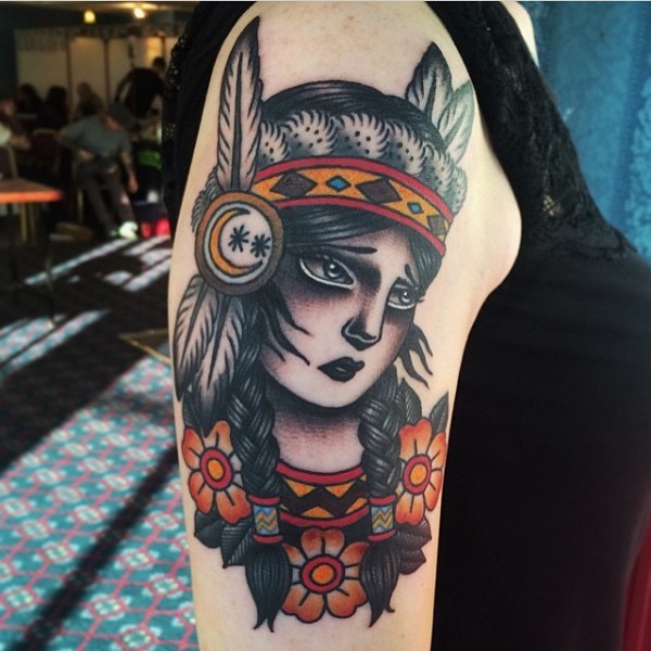 肩部老派风格的彩色印度妇女与鲜花纹身