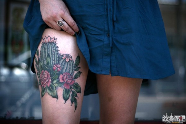 大腿上开了花的仙人掌和玫瑰花纹身图案