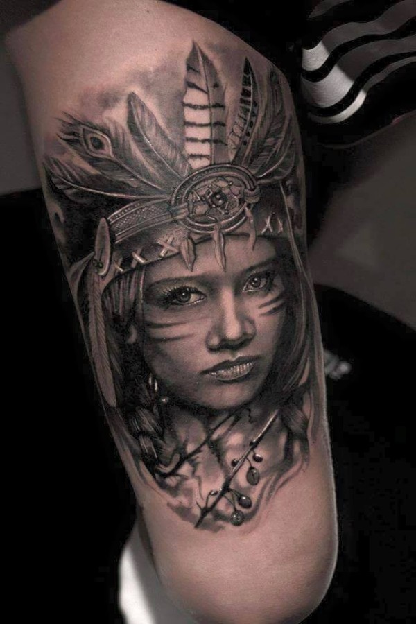 腿部逼真印度女人肖像纹身图案