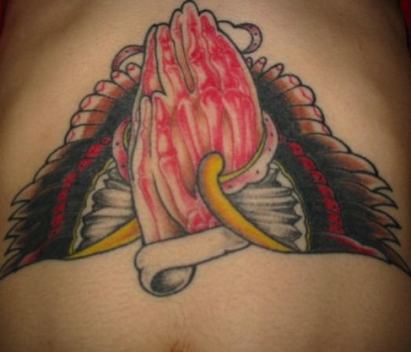 肩部彩色血腥祈祷的手纹身图案
