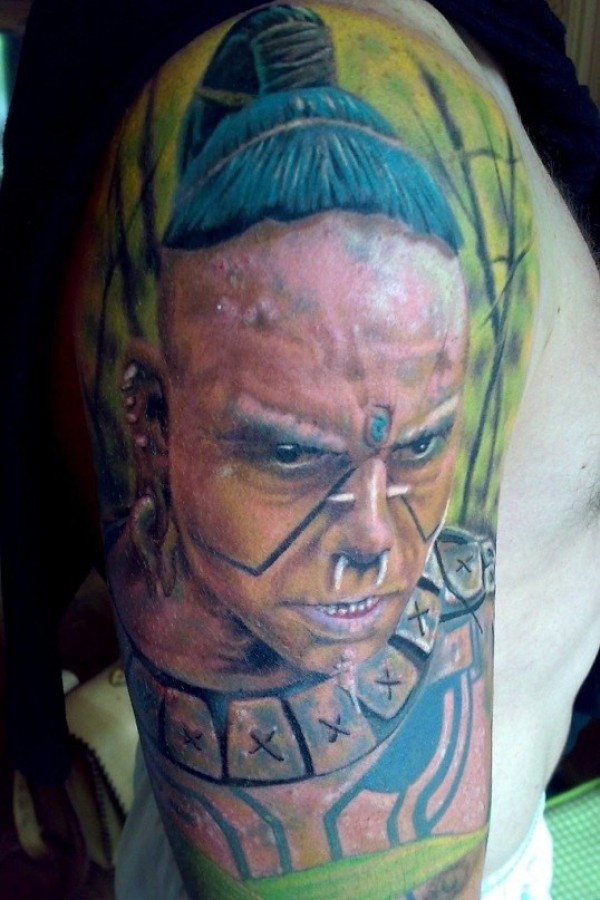 肩部彩色可怕的印度战士肖像纹身