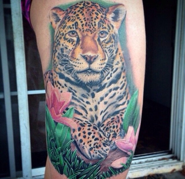 肩部彩色逼真的豹子纹身图案