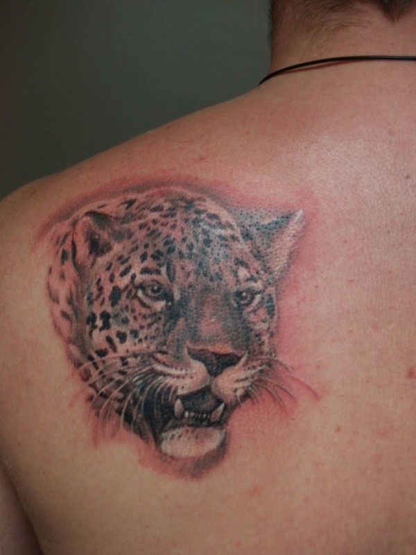 肩部逼真的彩色豹头纹身图案