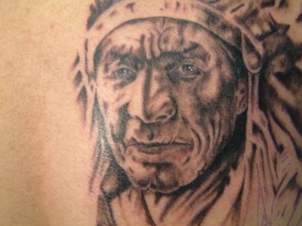 背部棕色老印度肖像纹身图案