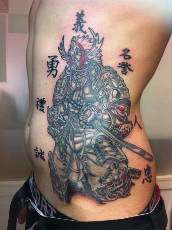 腰侧日本武士与文字纹身图案