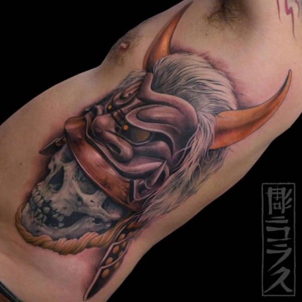腰侧新日式武士头骨与恶魔头盔纹身
