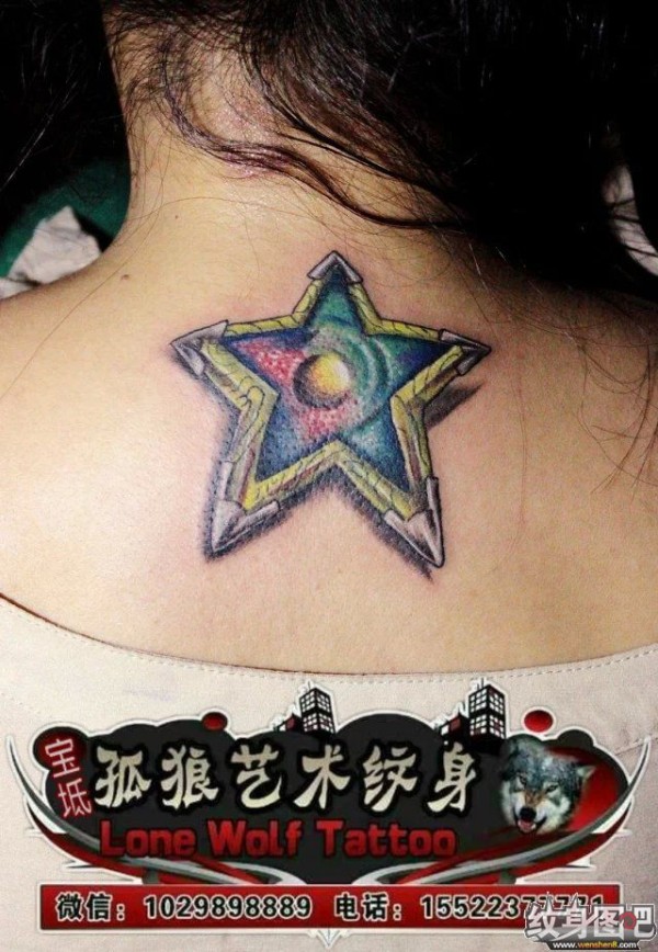美女脖子五角星星空纹身 天津宝坻孤狼纹身