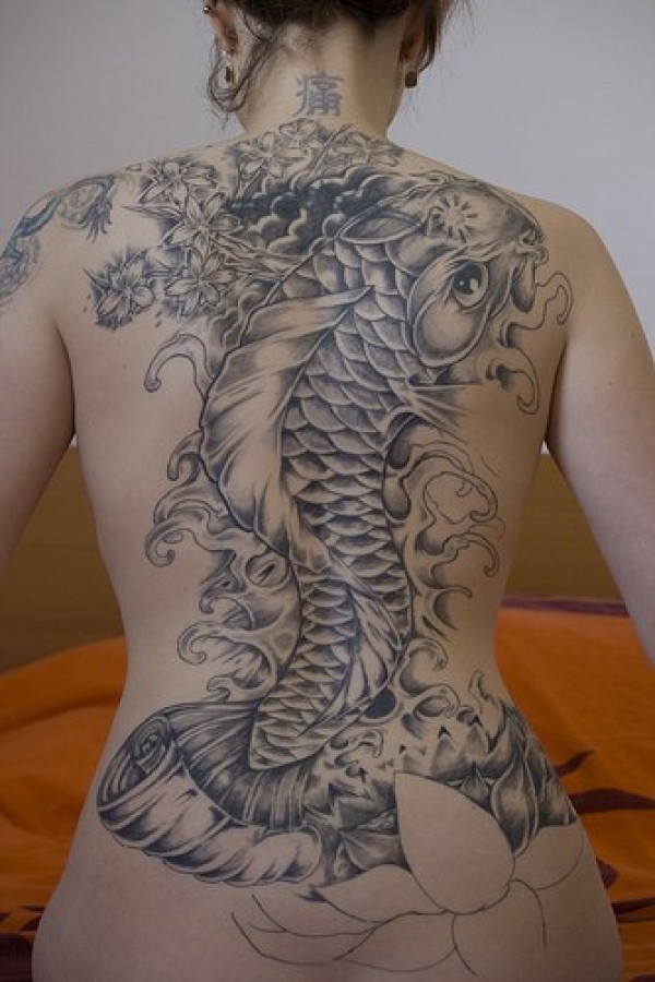 背部日本锦鲤不完整的纹身图案