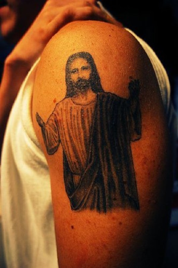 肩部黑色耶稣戴斗篷纹身图案