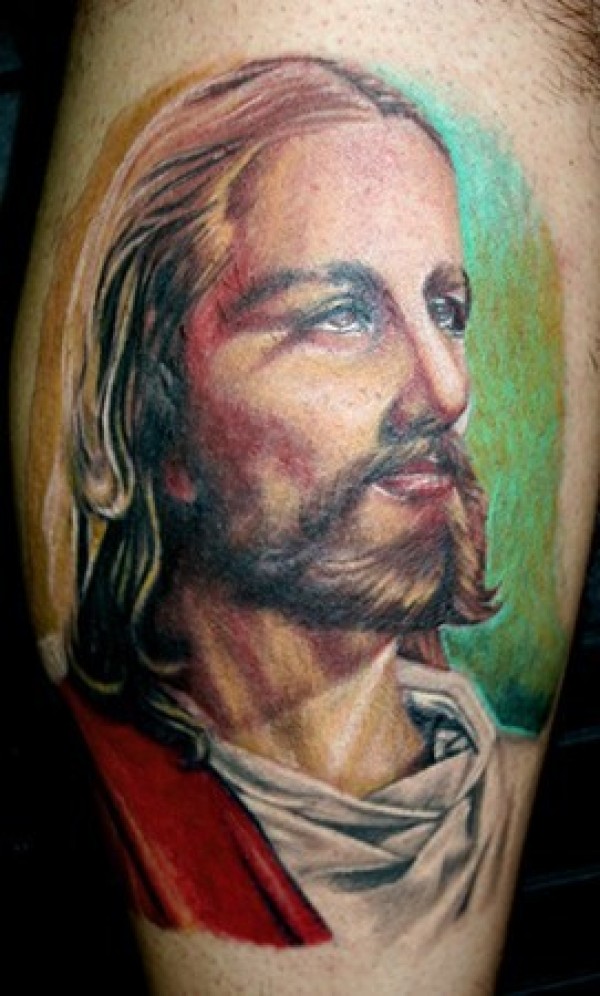肩部彩色耶稣肖像纹身图片