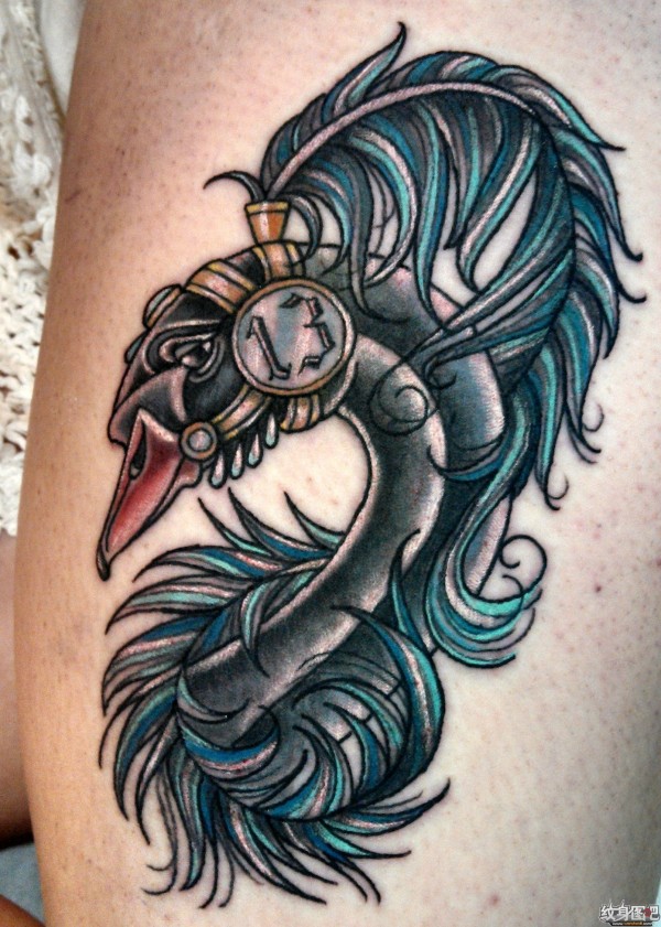 插着孔雀羽毛的黑天鹅纹身图案