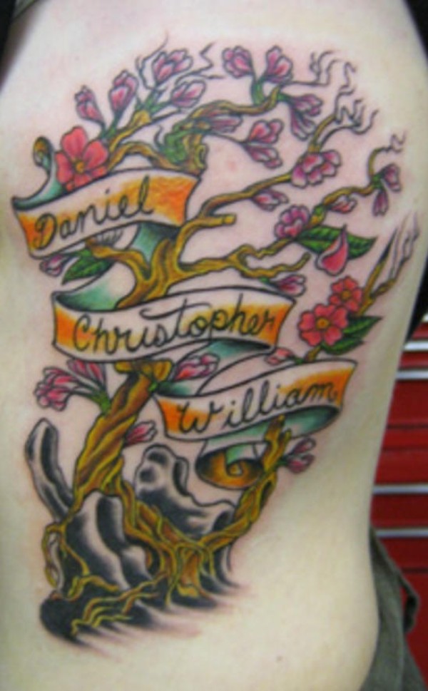 腰侧彩色樱花树和英文名字纹身