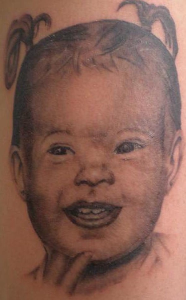 肩部棕色儿童肖像纹身图案