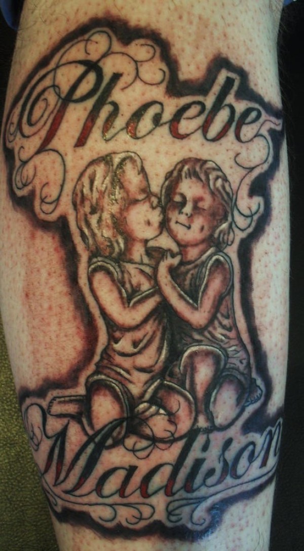 腿部棕色孩子菲比和麦迪逊纹身图案