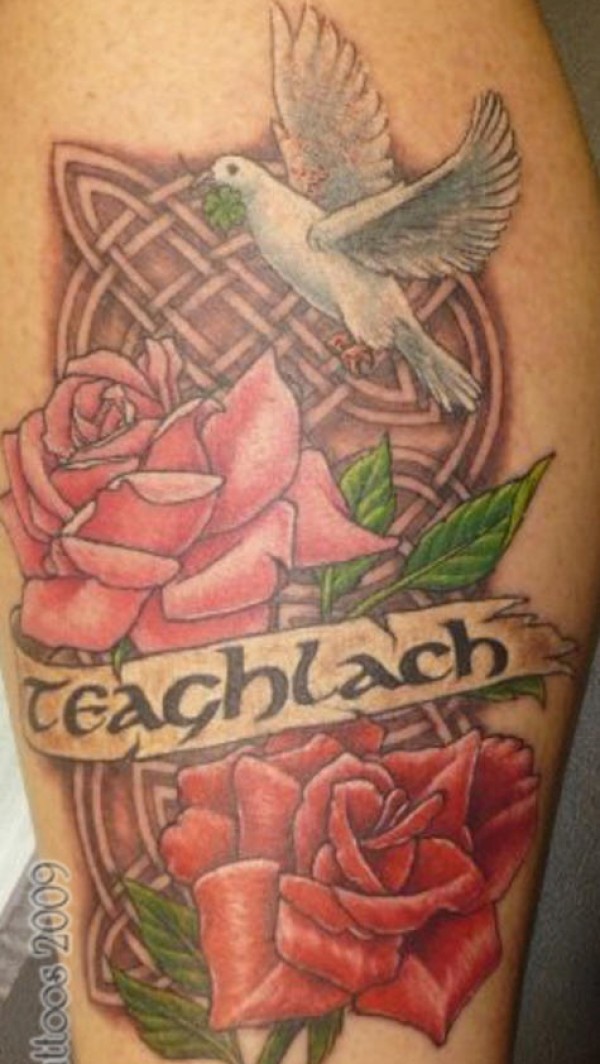 腿部彩色玫瑰花与鸽子纹身图片
