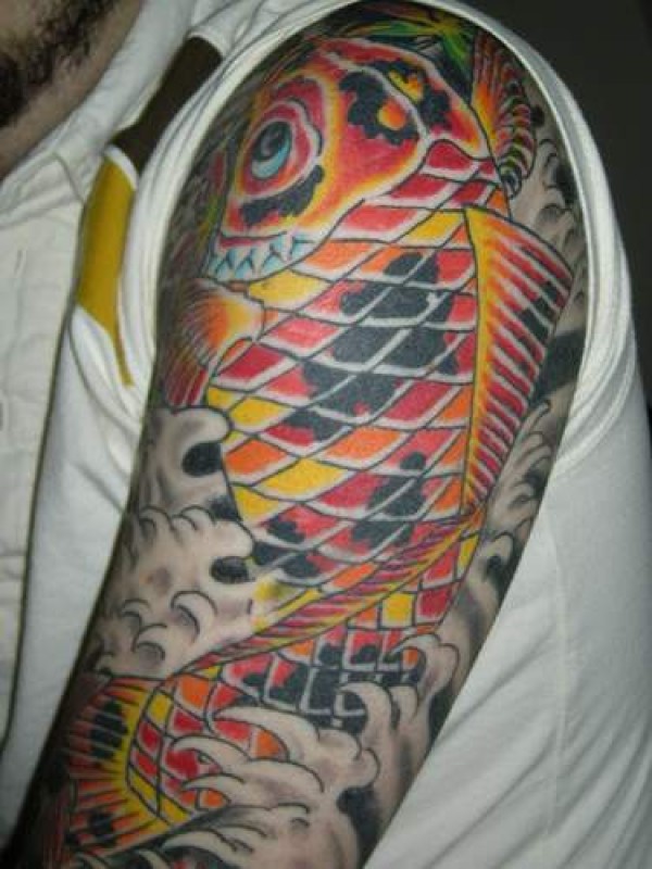 肩部大型的彩色锦鲤纹身图案