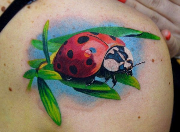 肩部色彩鲜艳的瓢虫纹身图案
