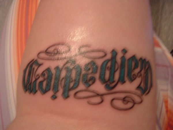 腿部彩色拉丁文花体纹身图片