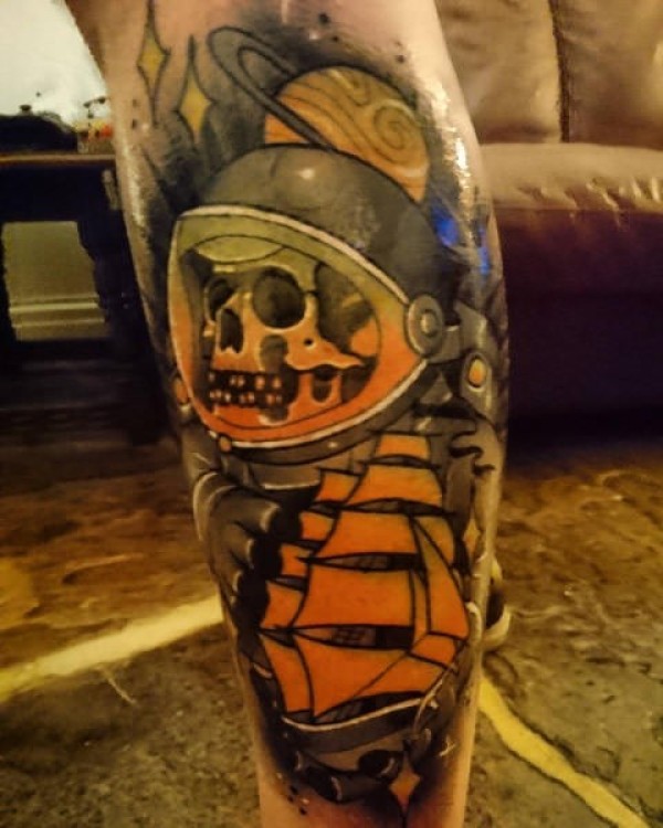 腿部彩色宇航员骷髅纹身图案