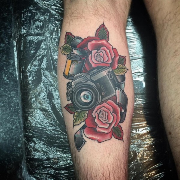 腿部彩色现代相机与玫瑰纹身图案