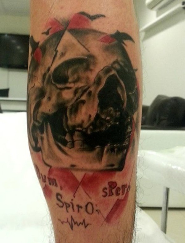腿部彩色插画风格骷髅头纹身图案