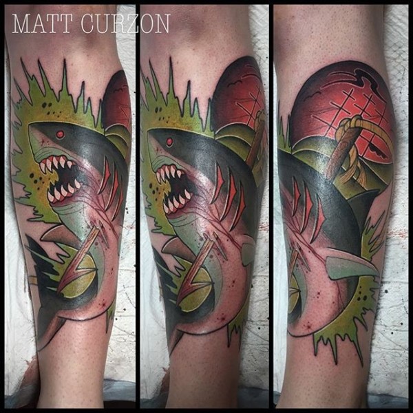 腿部彩色新的学校风格色鲨鱼纹身图案