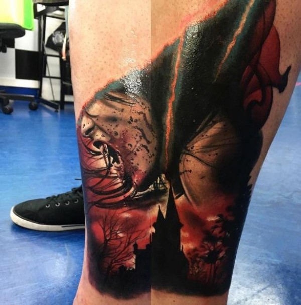 腿部彩色可怕的彩色血腥女吸血鬼纹身