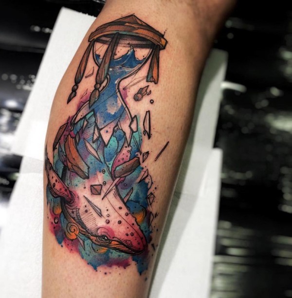 腿部全新学校风格的彩色大鲸鱼纹身图片