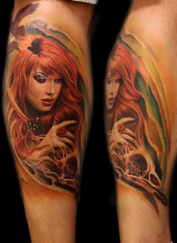 腿部彩色神秘色女人纹身图案