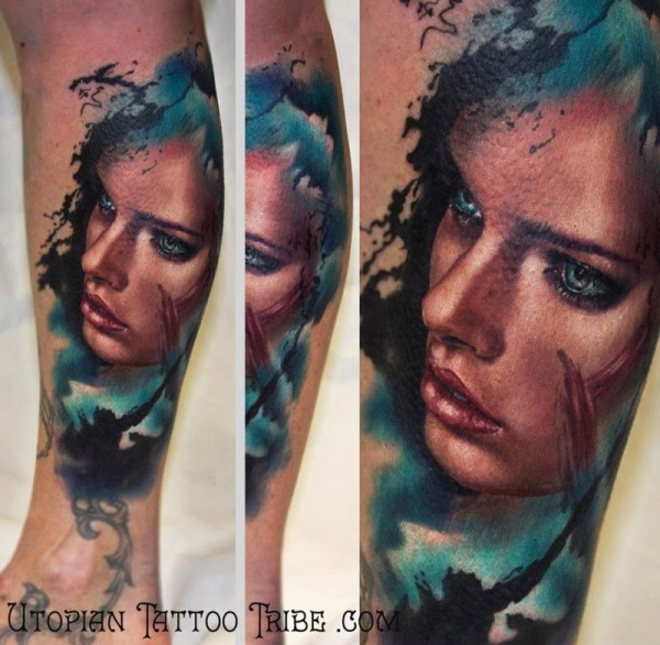 腿部全新学校风格彩色女子肖像纹身