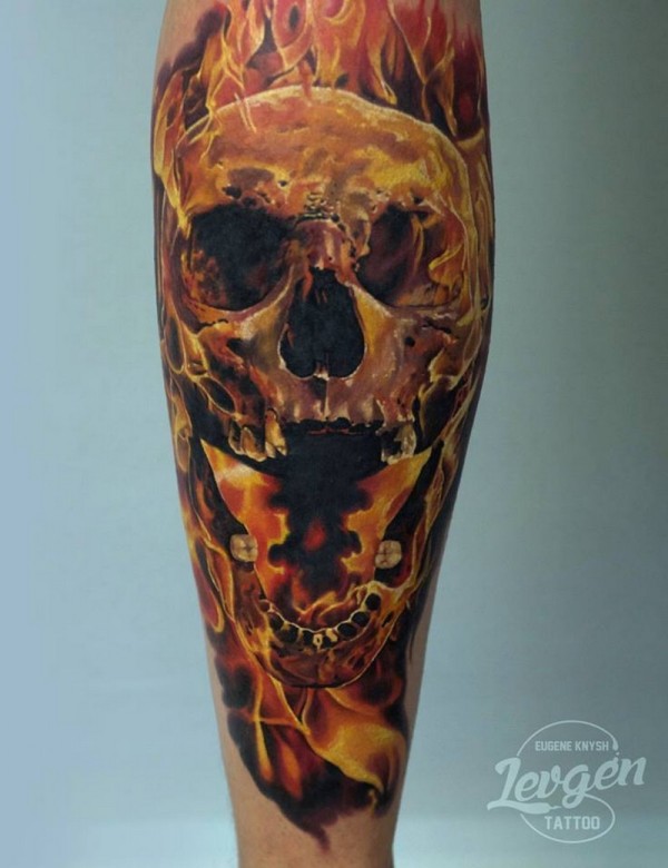 腿部彩色燃烧的骷髅头纹身图案