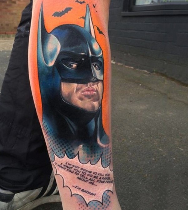 腿部漫画风格的彩色蝙蝠侠纹身图案