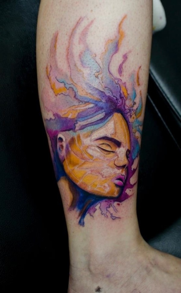 腿部全新学校风格彩色女子肖像纹身