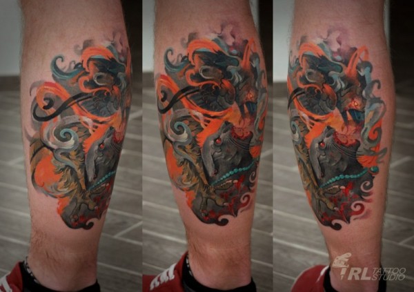 腿部彩色插画风格色恶魔豹纹身