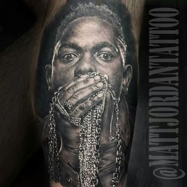 腿部灰色男人肖像纹身图案
