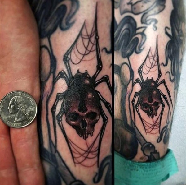 腿部新风格的彩色人类头骨与蜘蛛纹身